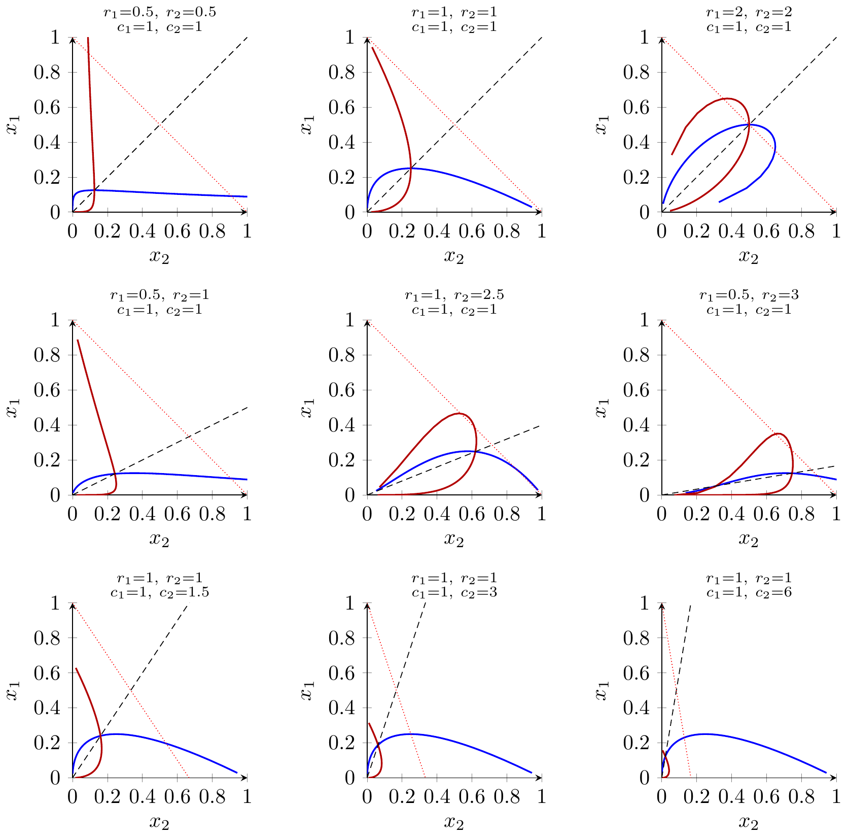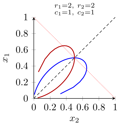 Symmetry for player 2. The same derivation, swapping the indices, yields a parametric best-response curve \((e_2(s),e_1(s))\) for player 2, where \(s\equiv e_2^{r_2}/e_1^{r_1}\) plays the role of \(t\) above.