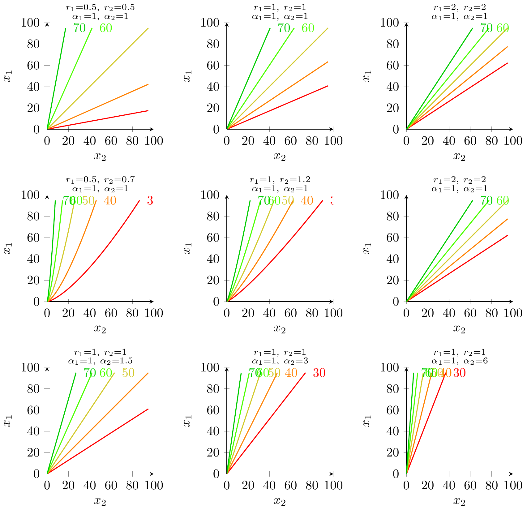 - Asymmetries in exponents \((r_1,r_2)\) change the curvature of the isovalue curve via the exponent \(r_2/r_1\). When \(r_1=r_2\) the locus is a straight line through the origin; when \(r_2\ne r_1\) it becomes a nonlinear curve.