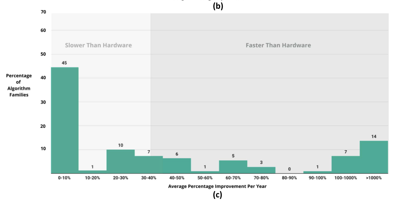 “We find enormous heterogeneity in algorithmic progress, with nearly half of algorithm families experiencing virtually no progress, while 14% experienced improvements orders of magnitude larger than hardware improvement (including Moore’s law).