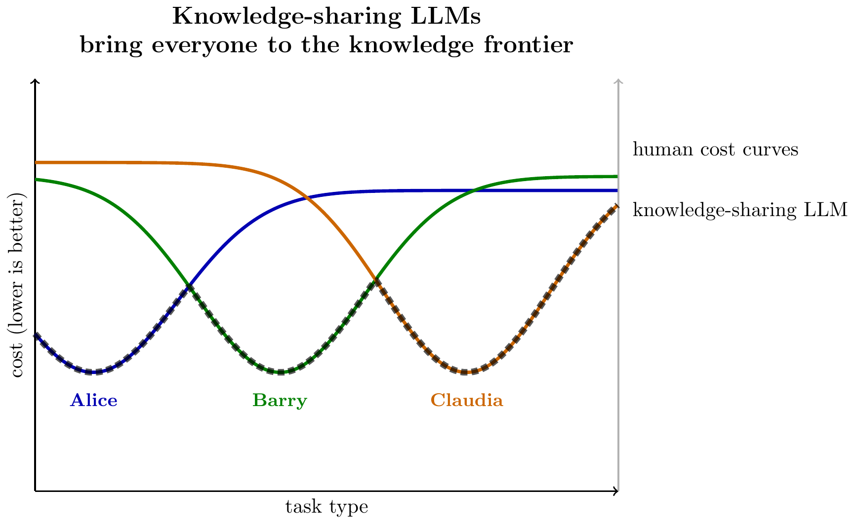 Here we draw the cost for a set of 3 humans across a range of tasks, assuming each has a specialty area where they have the lowest labor-cost. The knowledge-sharing LLM aggregates knowledge, and so is the lower bound across all three agents.