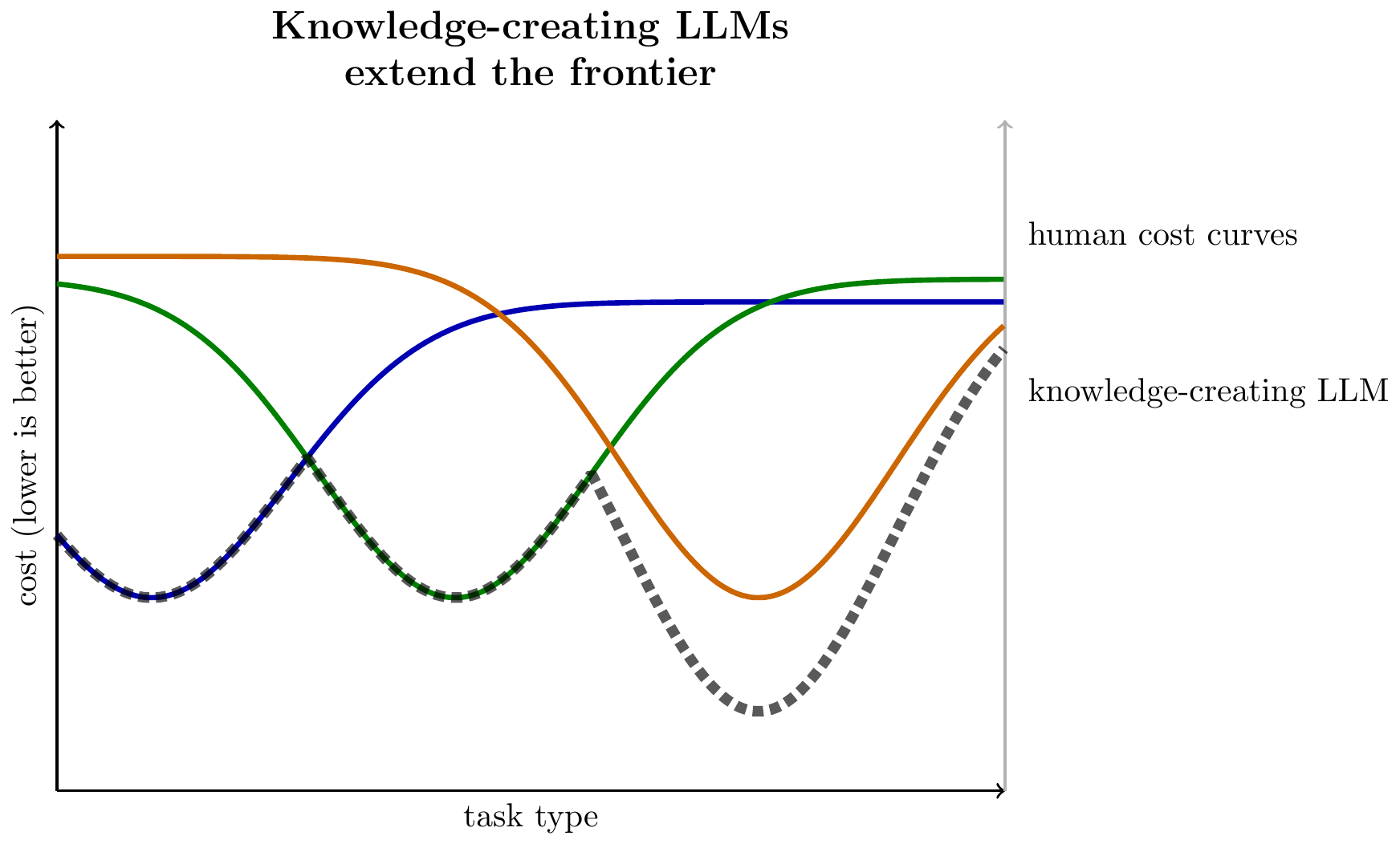 We can then illustrate a knowledge-creating LLM as pushing below the human frontier at some set of tasks: